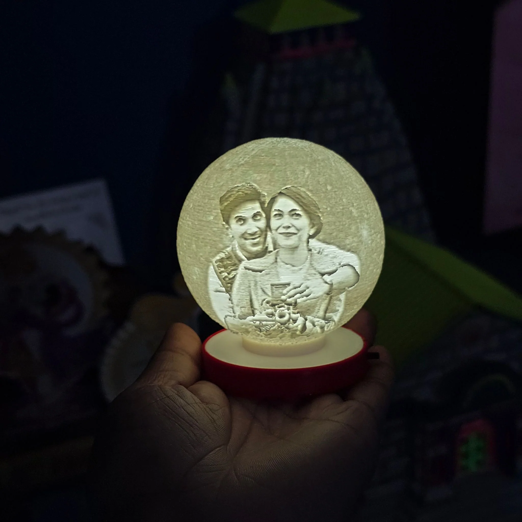A beautifully crafted 3D Printed moon lamp featuring your favorite photo, creating a warm and personalized glow. This lamp is perfect for adding a personal touch to any room and makes an excellent gift for any occasion.